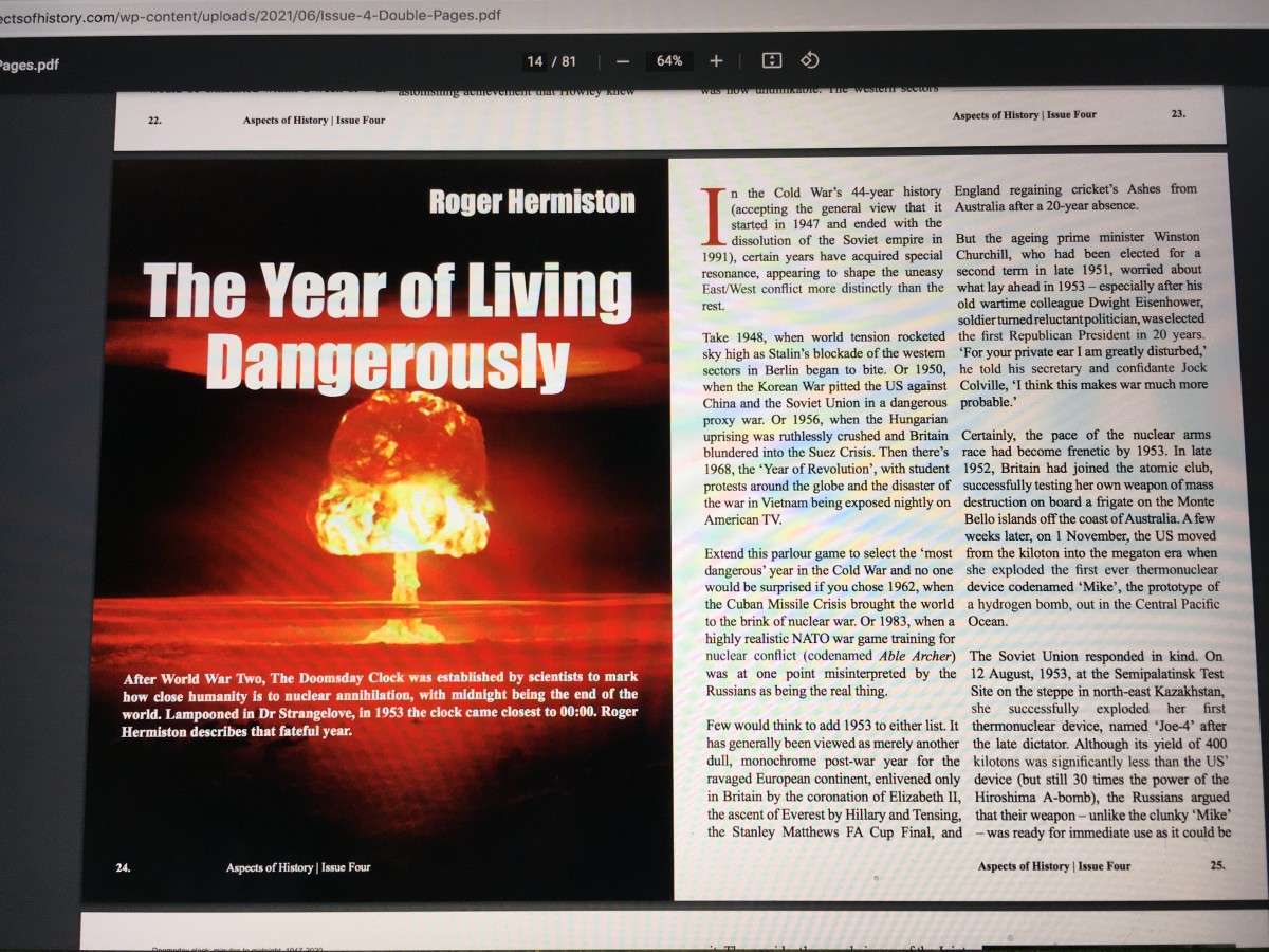 * Roger Hermiston’s book, ‘Two Minutes to Midnight – 1953, the Year of Living Dangerously’ (Biteback), has just been published..
